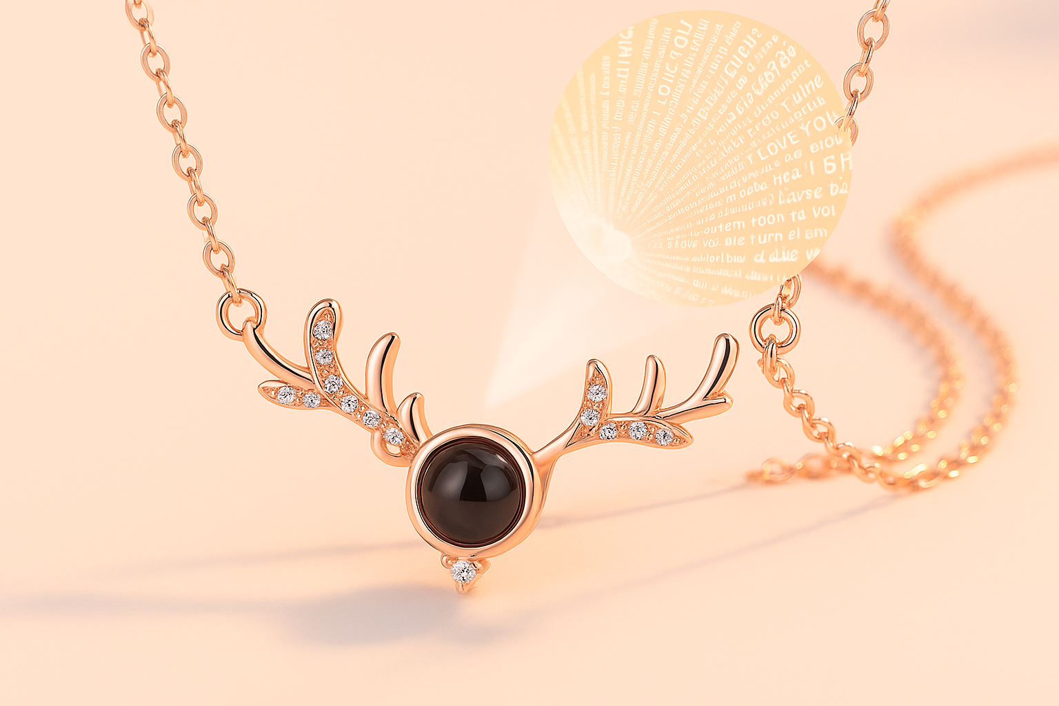 Diese elegante Hirsch-Halskette kombiniert Symbolik, Eleganz und modernste Projektionstechnologie. Der fein gearbeitete Hirschgeweih-Anhänger ist mit funkelnden Zirkonia-Steinen verziert und umrahmt einen schwarzen, polierten Projektionsstein. Dieser kann – je nach Variante – beim richtigen Licht kleine Texte oder Muster sichtbar machen, was die Kette zu einem besonders persönlichen und romantischen Geschenk macht.